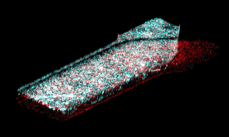 Samuel: We re-created living tissues of blood vessels and cells called spinal motor neurons, which control muscles, so we could see how they interact. The blue parts are the layers of motor neuron cells that form in the spine. The red are cells from capillaries, the tiniest blood vessels. They're interacting together on this chip.